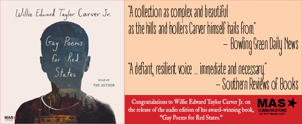• Acclaimed poet and author Willie Edward Taylor Carver Jr., whose “Gay Poems for Red States” earned multiple awards and accolades after it was published in 2023 by the University of Kentucky Press. With permission from UK Press, MAS Communications now offers the book as an Audio Book, read by the author. Upon release in December 2025, the audio book reached No. 1 on Amazon’s Poetry Audio books and propelled the print edition into the Top 15 again. Willie is an LGBTQ+ youth advocate and KY Teacher of the Year. “Gay Poems for Red States” is a Stonewall honor, Whippoorwill, American Library Association, Read Appalachia, and Book Riot Award recipient shortlisted for the 2024 Judy Gaines-Young Book Award. His novel, Tore All to Pieces arrives March 2026 from the University of Kentucky Press. Willie’s writing has been published in Appalachian Journal, Southern Humanities Review, Young Ravens Review, Another Chicago, Harbor Review, Smoky Blue Literary, Miracle Monocle, Good River Review, Salvation South, Gay & Lesbian Review, among others. He writes from Appalachia and believes everyone’s story matters.